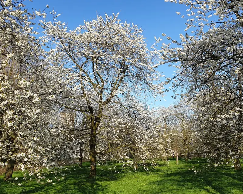 Pruimen en kersen gaan als eerste. Roze en wit, dicht op de takken, vroeg in april.